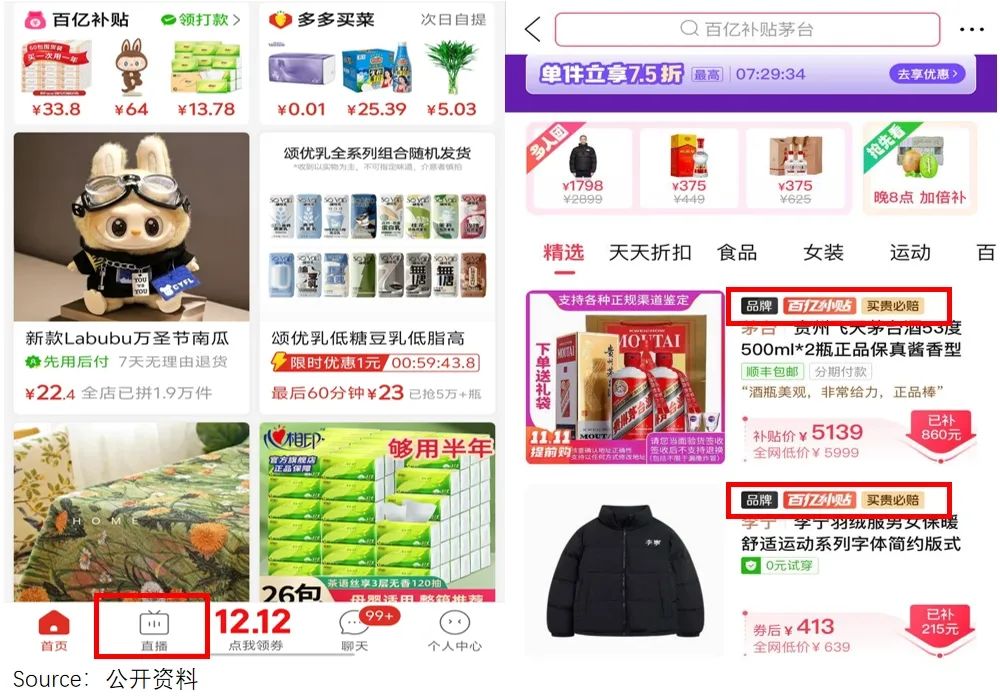 拼多多不只是说说而已。可以看出,其APP首页底部的Tab2是直播入口,明显偏向有条件直播的品牌商家;100亿补贴等高流量渠道也增加了品牌产品的曝光度,不再“只有低价理论”。