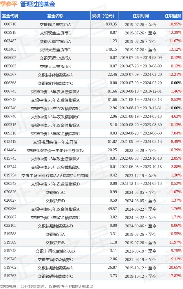 交通银行稳定滚动30天,债券A基金经理变更:增聘季参平为基金经理。