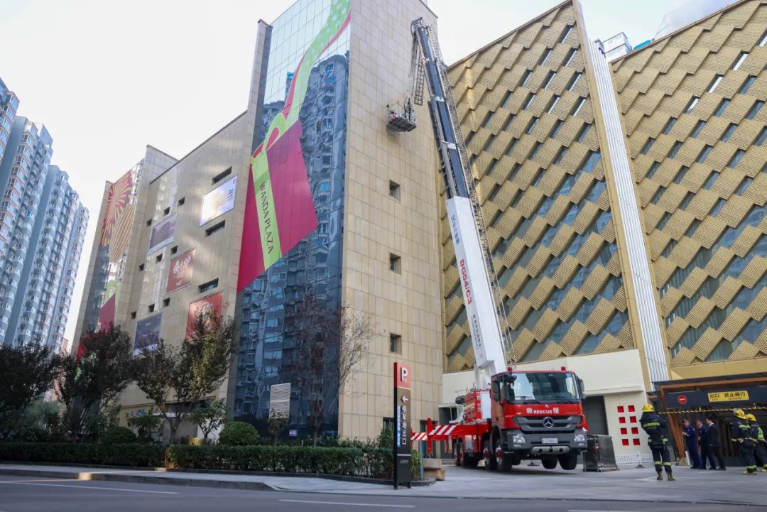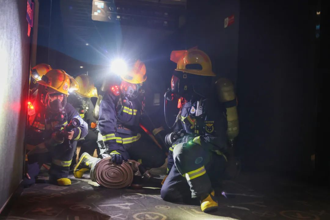 演练模拟万达广场中庭新能源汽车、电影院放映厅、餐饮部厨房等重要部位同时出现危险。现场火灾凶猛,烟雾弥漫,许多人被困。