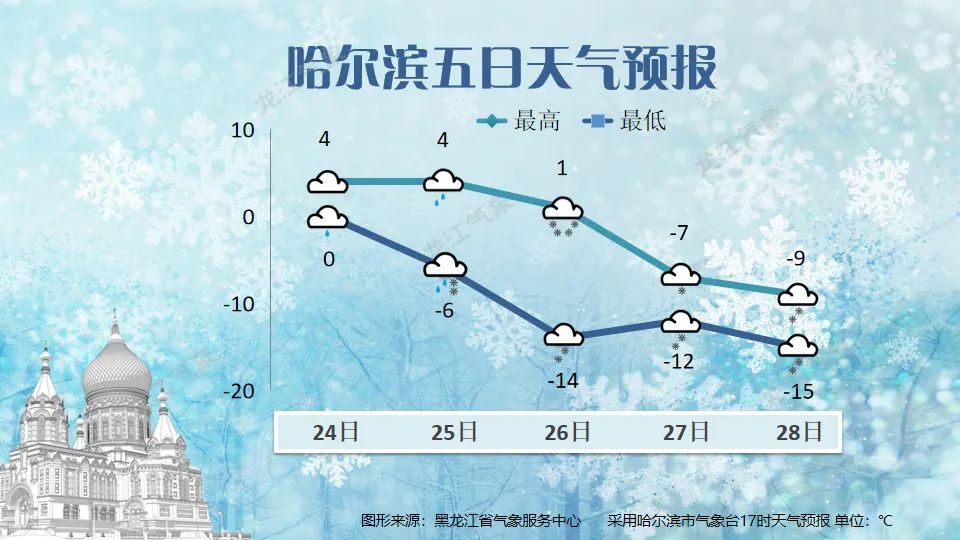 24日白天最高气温:大兴安岭北-10~-8℃,大兴安岭南部,黑河-5℃~-3℃,大庆,绥化南部,哈尔滨。~4℃,其他地区-1℃~1℃。