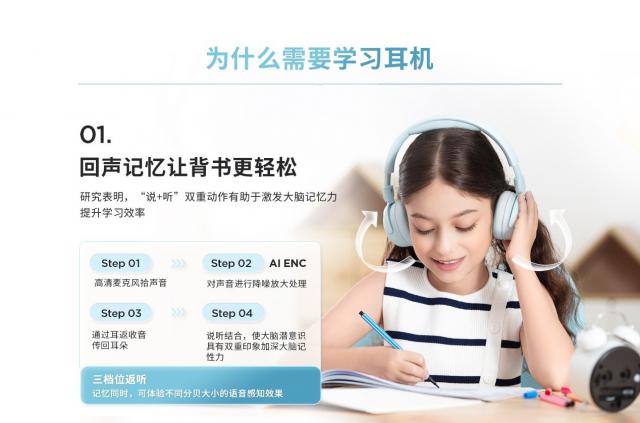 1MORE HQ20 不只是一款听力保护耳机,还可以提高学习耳机的效率。根据科学研究,“说” 听力“双重动作有助于激发大脑记忆,从而提高学习效率。1MORE HQ20 通过超清话筒拾音,具有即时返听功能,AIENC 降噪放大声音,让回听声音的语气更准确,语气更准确。在说话和听话之间,大脑潜意识对关键知识点有双重印象,加深大脑记忆。