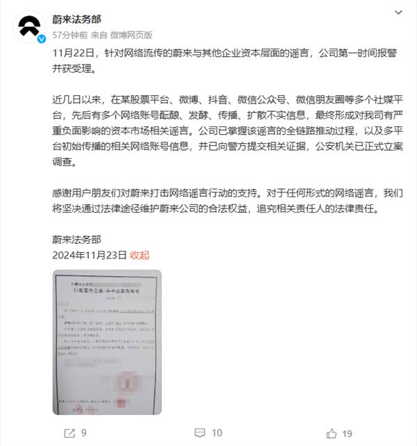 蔚来:关于网络爆炸和其他公司资本方面的谣言 公司已报警