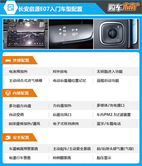 长安启源 E07 入门级车型是厂家指导价。 19.99 万元的纯电 70kWh Air 智能版。虽然是入门级车型,但整体表现并不差,比如无勺进入功能、电动后备箱、方向盘加热、前排座椅加热等。 / 便利性和舒适性配置,如通风、自动空调、前排手机无线充电等。之所以不推荐入门级车型,主要是因为性价比更高,性能更好。
