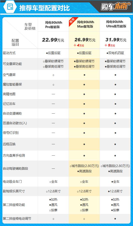 从配置对比来看,与低级别车型相比,两款推荐车型在驾驶功能上有了明显的提升,如高精度地图、记忆停车、自动变道辅助、匝道自动离开等。 ( 入 ) 、远程召唤等,同时,低级别车型需要加价选择的可变悬架功能、空气悬架、魔毯智能悬架也成为标准。车辆体验更好,车辆动态性能提高,但价格只提高。 4 一万元,可谓性价比极高。高一级车型比较推荐的车型主要是将一些外观选择出来。 / 安全性和舒适性配置由选择变为标准,例如电动调节第二排座椅,12.8 英尺副驾驶娱乐屏、电动吸合门等;与此同时,它也从推荐车型的后置单电机转变为前后双电机。虽然设备和性能都有所提高,但是由于购车预算还会增加。 5 万元,性价比不高。