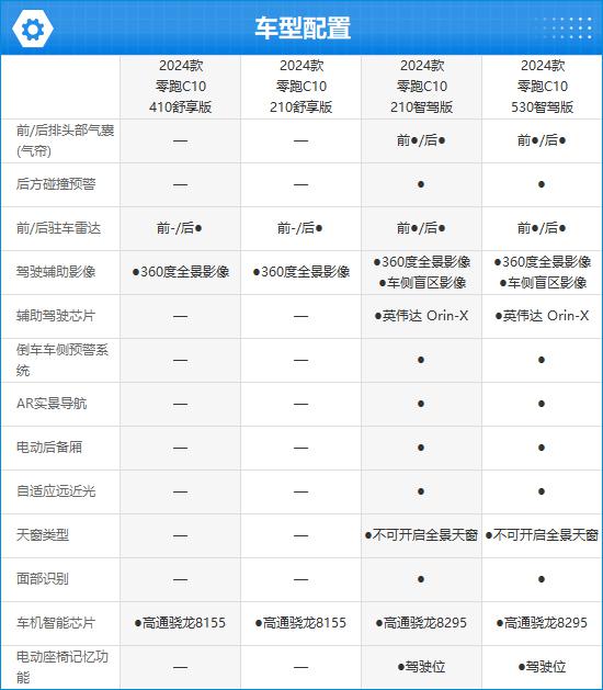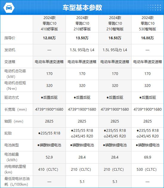 2024 款零跑 C10 提供增程式和纯电动两种动力选择,电动机总功率均为 总扭距170kW 320N · m,传动装置与电瓶车单速变速箱相匹配。装备方面,两种动力的入门级车型都略显寒酸,没有任何亮点。相比之下,高配版车型在舒适性、安全性、驾驶辅助功能等方面都有很好的表现,能让人满意。由于价格区间本来就比较亲民,所以总体来说,高配车型的性价比还是比较高的。