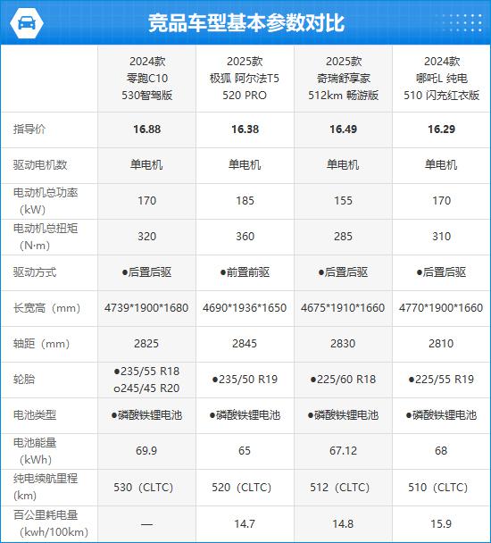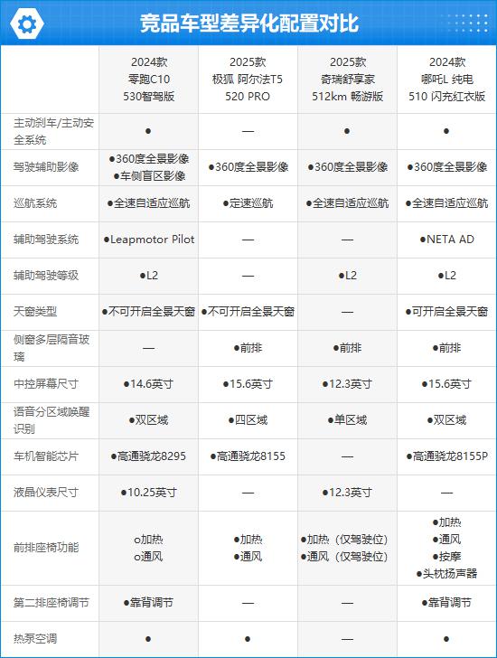 国产纯电动中型 SUV 市场非常巨大,每个价格区间都有很多可供选择的产品。综合市场定位和价格考虑,最后我为零跑。 C10 选择了极狐阿尔法的竞争车型。 T5、奇瑞舒享家和哪一个 L。具体而言,在性能参数、尺寸和配置方面,零跑 C10 都达到了同级别的主流水平,甚至在某些阶段还略有优势。尽管其选择对比的车型价格最高,但仍显示出不错的性价比,也算是物有所值。