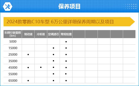 2024 款零跑 C10 整个车辆的保修期为四年或四年 12 万公里,第一个纯电动车主(非运营)终身免费三电质保;第一个增程车主(非运营)终身保修(详情请咨询当地经销商)。维修方面,零跑 C10 增程版车型首次维护为 5000 公里,需要对电池、供电系统和电机进行常规检查。后续每 10000 每公里进行一次常规检查,每公里空调滤芯。 10000 公司更换一次;每次刹车油; 20000 每公里更换一次;每公里更换一次冷冻液; 40000 更换一次公公。