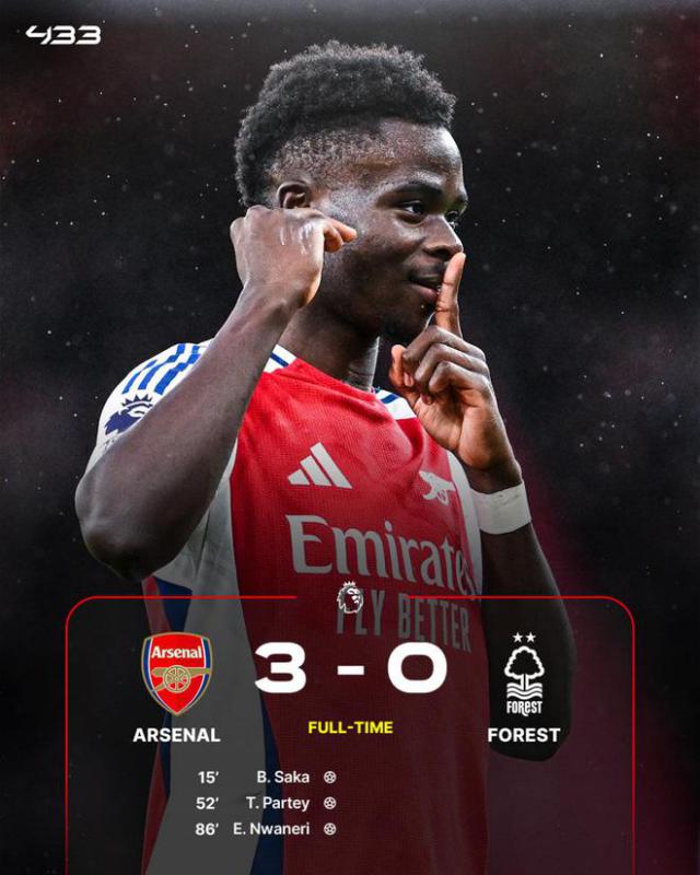 阿森纳主场 3-0 击败诺丁汉森林,结束诺丁汉森林 4 英超联赛无敌。萨卡传射功勋,托马斯世界波,斯特林助攻,17 年恩瓦内里得到了英超处子球。
