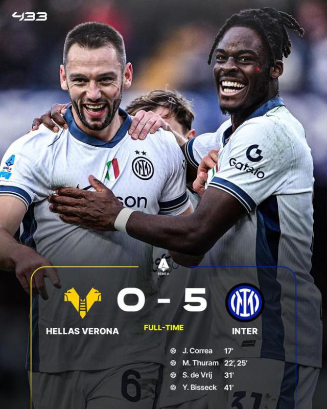 国米客场 5-0 赢得维罗纳,联赛 8 轮不败,先赛登顶积分榜。小图拉姆 2 射 1 传,科雷亚 1 射 2 传说,德弗里,比塞克破门。