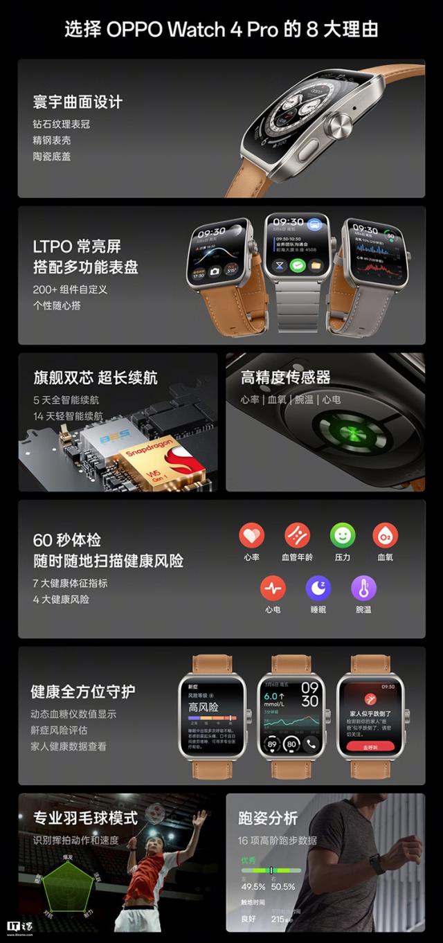 现在官网还没有提到 OPPO Watch 4 Pro “高尔夫定制版”智能手表具体产品参数,预计配置与专业版一致,并增加了高尔夫定制内容。IT 世家整理 OPPO Watch 4 Pro 智能手表的亮点信息如下: