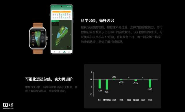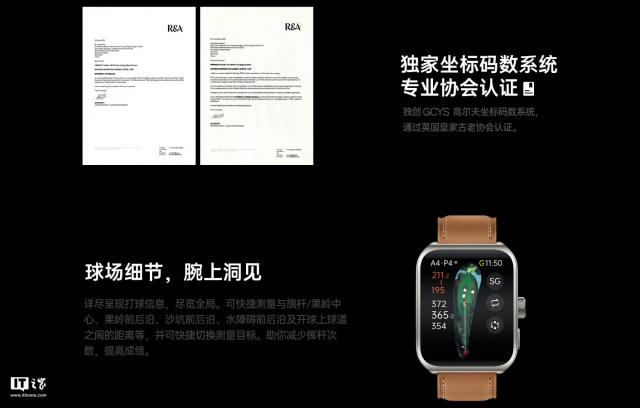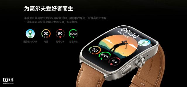 据报道,这款手表是泛美高尔夫大师应用的深度定制,包括定制高尔夫表盘,可以显示温度、运动心率、运动步数等信息,支持泛美高尔夫大师一键应用。