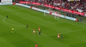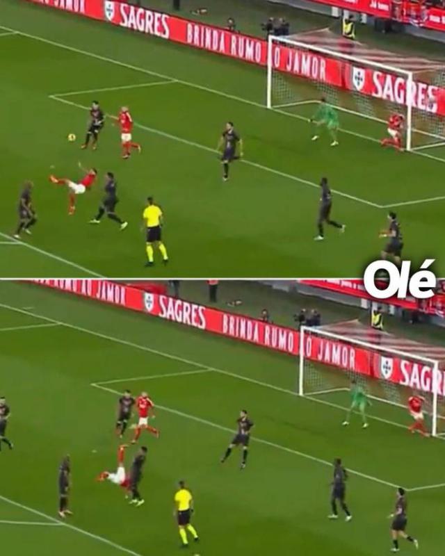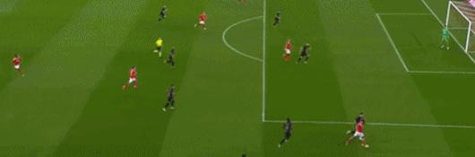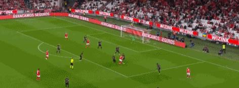第 5 几分钟后,最精彩的一幕发生了:本菲卡的底传中,对方门将击出球门,迪马利亚背对着球门挑出球门。挑出防守球员后,左腿倒钩破门,梅开二度!