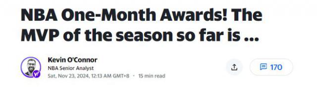 北京时间 11 月 24 日,NBA 常规赛已经宣战一个月了,美媒雅虎体育在第一个月就选出了各大奖项。约基奇是 MVP,麦凯恩是最好的新秀,文班亚马是最好的防守球员,普里查德是最好的第六人,骑士的阿特金森是最好的教练,掘金的布劳恩是进步最快的球员。此外,他们还评选了第一个月的最佳阵容、最佳防守阵容和最佳新秀阵容。