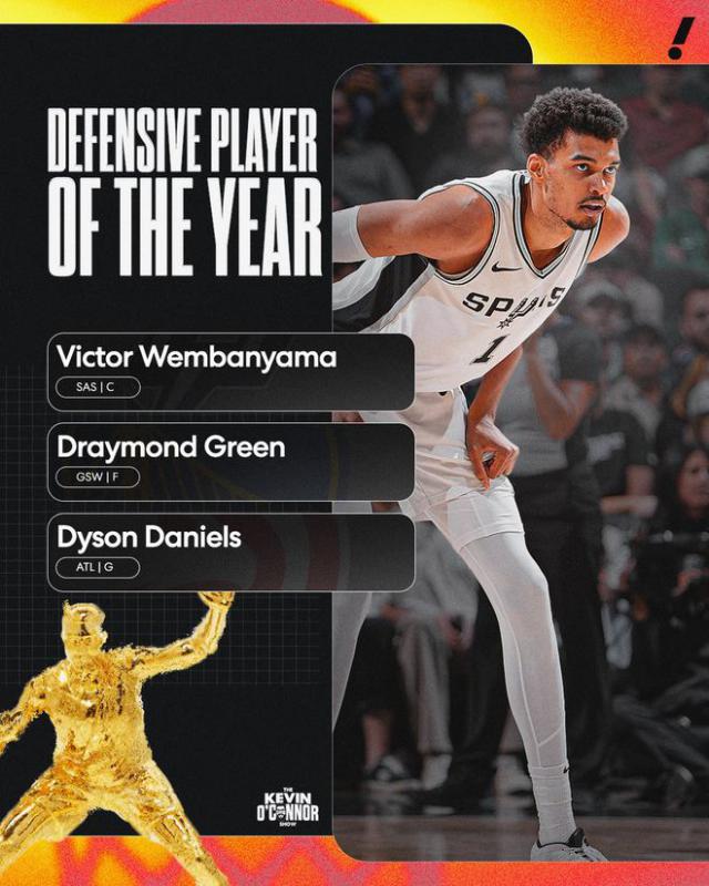 在最佳防守球员奖项方面,前三名如下——