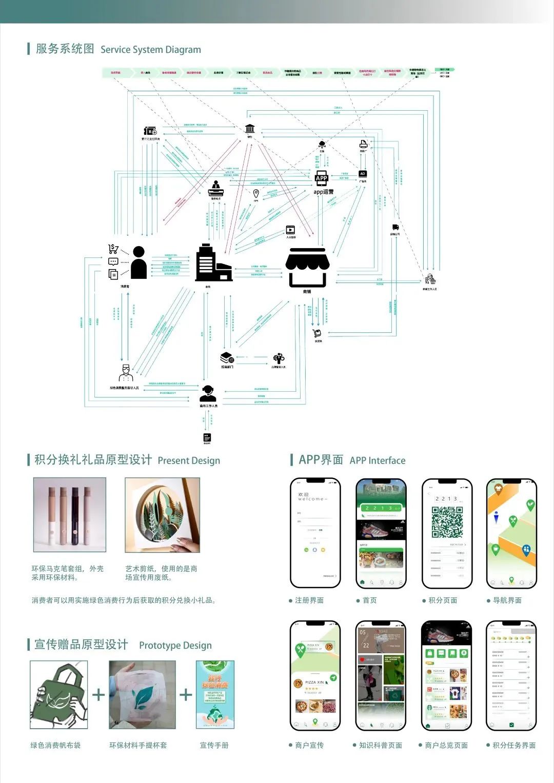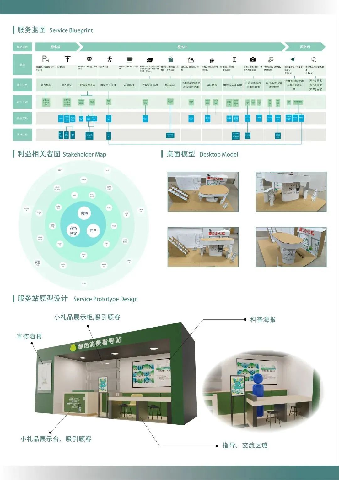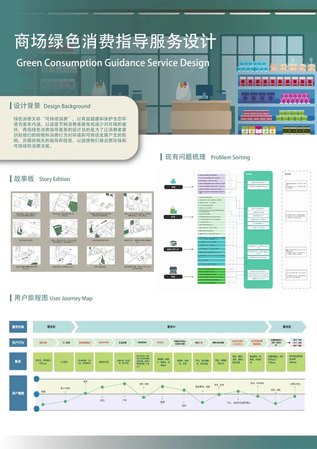 通过数字技术和创新的服务设计,产品设计团队一等奖作品《商场绿色消费指导服务设计》以商场这一现代城市生活的重要场景为服务场所,旨在促进绿色消费行为的普及,构建可持续的商业模式。“我们希望通过这种设计,引导消费者更加关注环境保护和可持续发展。”作者周欣怡说。