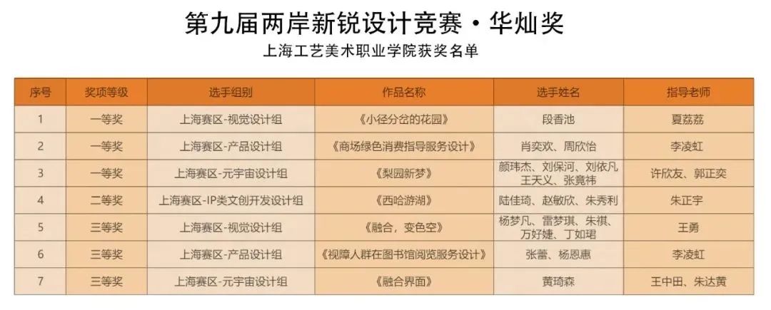 近日,第九届海峡两岸前沿设计大赛华灿奖上海赛区审查结果公布,上海工艺美术职业学院获三个一等奖、一个二等奖、三个三等奖。