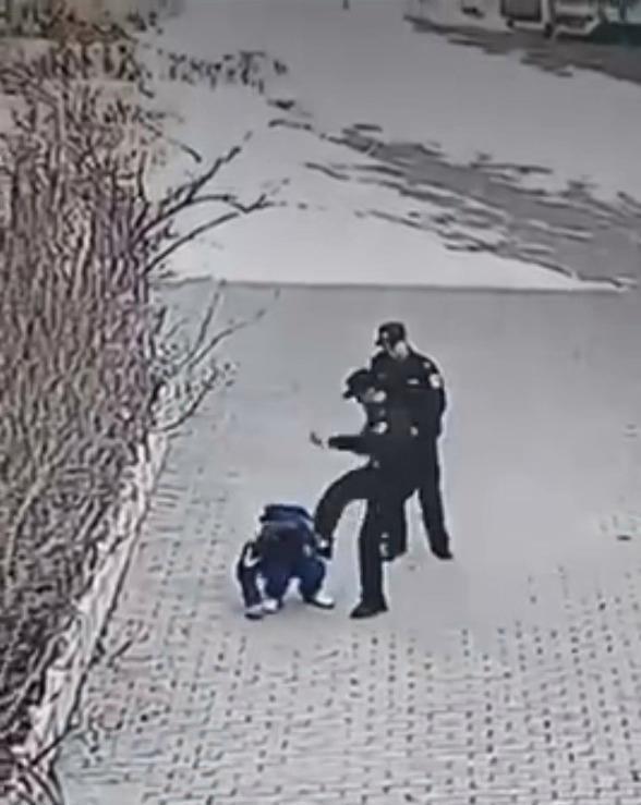 在网友发布的一段视频中,两个穿制服的男人走在路上,一个男孩向他们走来。双方见面后,两个穿制服的男人拦住了男孩,其中一个扇了男孩的脸,然后踢了男孩一脚。男孩被打倒在地后,打人的人拽着男孩的头发,拉起来踢了男孩一脚,用膝盖顶住了男孩的头。