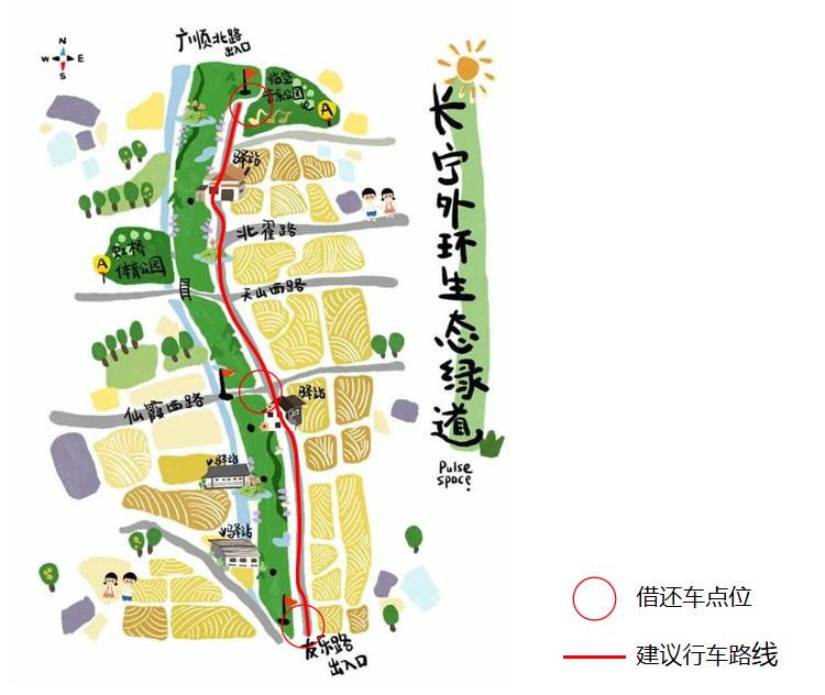 为方便市民和游客使用,长宁外环绿道设立了临空音乐公园进出口、仙霞西路进出口、友乐路出入口三个共享自行车网站。