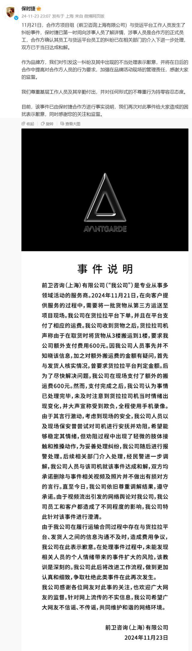11 月 21 当天,合作伙伴项目组(新潮咨询上海有限公司)与货运平台工作人员发生纠纷。保时捷已第一时间向涉案人员了解详情。涉案人员是合作伙伴的正式员工。合作伙伴确认,在相关部门的介入下,员工与货运平台员工之间的纠纷已经进一步处理,双方当天已经达成调解。