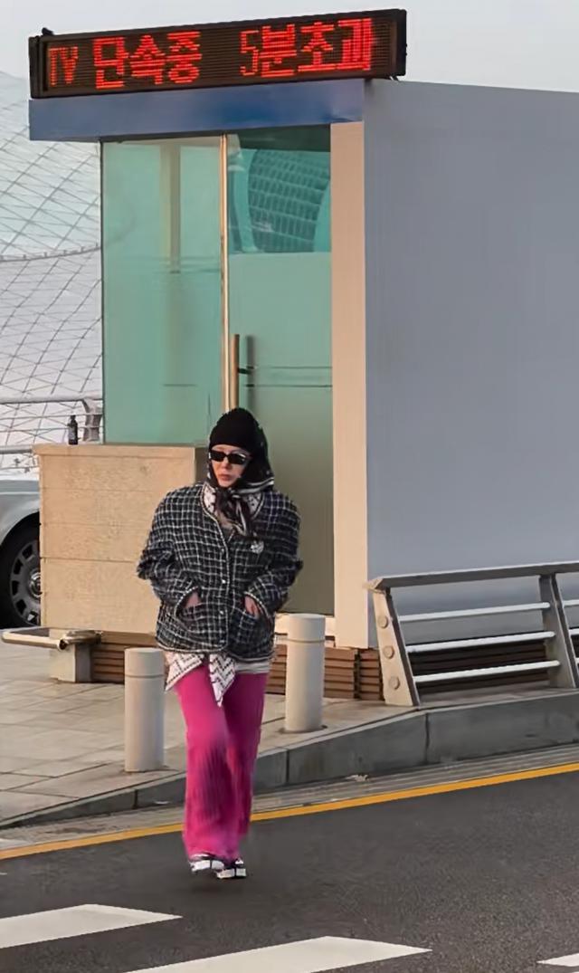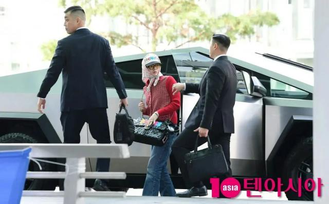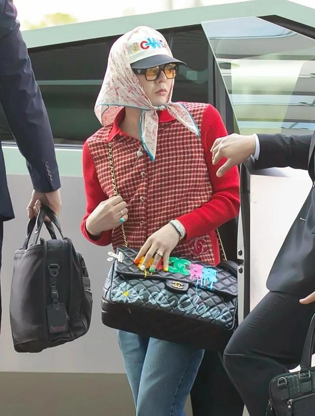 提到最出圈的方巾造型,还得数数。 11 月初,权志龙从韩国仁川飞往中国香港机场——白色碎花方巾,彩色字母帽,红色格子毛衣搭配牛仔裤,名牌包上印着涂鸦风格的彩色字母,仿佛他独自承包了韩国红毯剥夺的所有颜色。