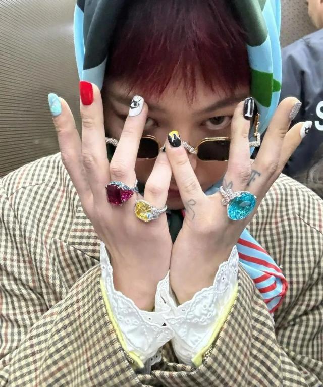 并将指甲涂成五颜六色,然后戴上一枚有塑料感的彩色钻戒。全身点缀配色,主推一个色彩斑斓,令人眼花缭乱。