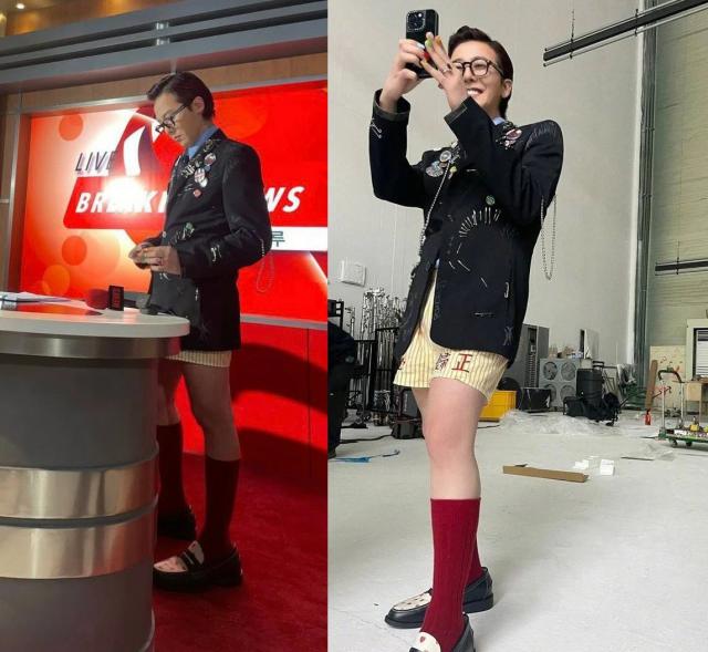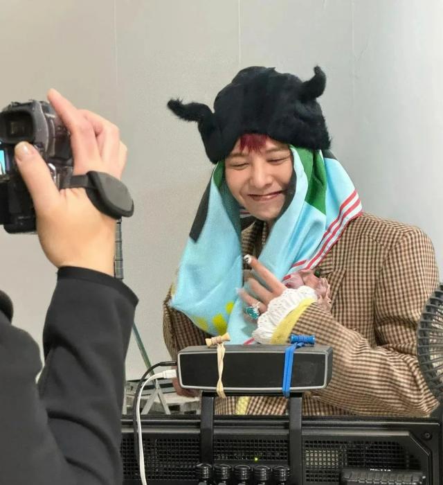 最近权志龙的造型很难理解:方巾不离身,西安装裤衩,还和农村大姨撞衫。