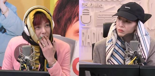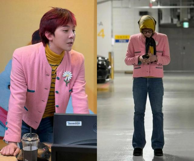 日前,权志龙录制电台广播,穿着一件粉红色的外套,别了白色针织小花胸针,头上是一条黄色的黑边方巾。