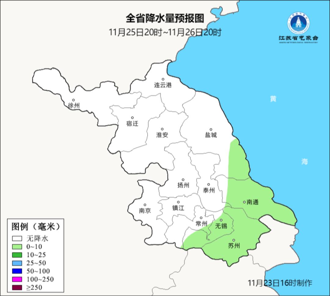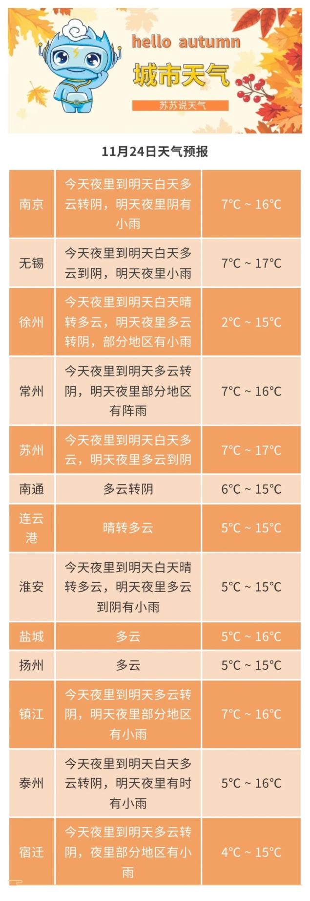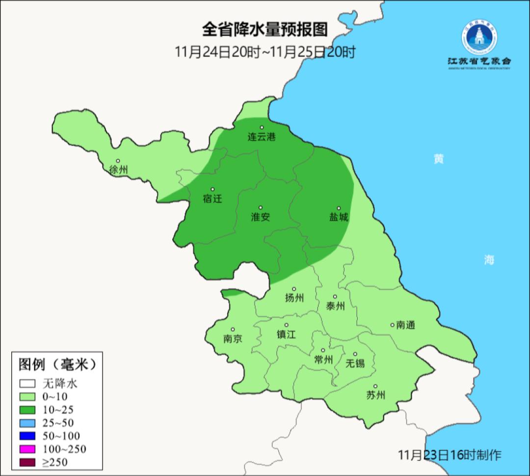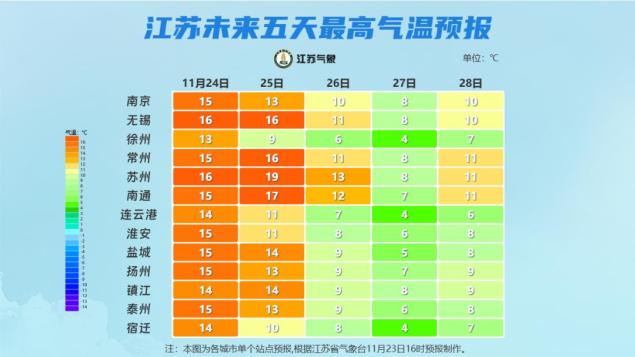 十一月二十三日20时至十一月二十四日20时,全省晴转多云。最高气温:江苏西北部13~14℃,其他地区约16℃;最低温度:苏南南部约8℃,淮北约4℃,其他地区约5℃,其他地区约5℃。~6℃。省内东北风转偏东风,风速约为4级。