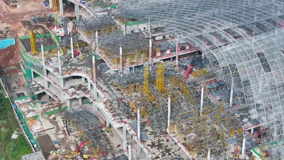 据报道,天府站钢结构屋盖采用双曲双弧复合结构体系,选用双曲渐变网架。 单层箱形桁架双曲渐变 凤凰眼歪曲箱形排架结构完美贴合“筑巢引凤”的设计造型,造型寓意深远。它的屋架平面南北方向长约494米,东西方向宽约305米,屋架角落最大悬挑长度约32米,最高点标高约51米。站房区采用弧形厚四角锥混合网架结构,侧站房区域,网架最大跨度为118米,网架最大厚度为6米,网架最大悬挑长度约32米,屋架无缝。