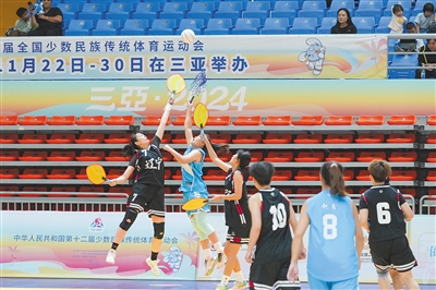 ③11月23日上午,海南队在第十二届全国少数民族传统体育运动会珍珠球比赛中迎战辽宁队。海报集团全媒体记者 曹志 摄