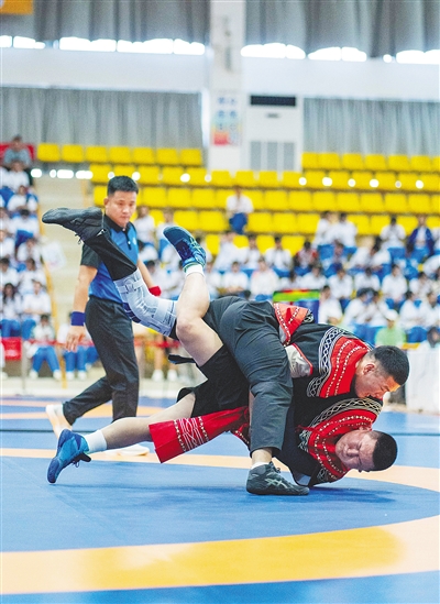②十一月二十三日,在民族式摔倒格(彝族式摔倒)比赛中,广东选手松布日与西藏选手次旺益西交锋。海报集团全媒体记者 刘孙谋 摄