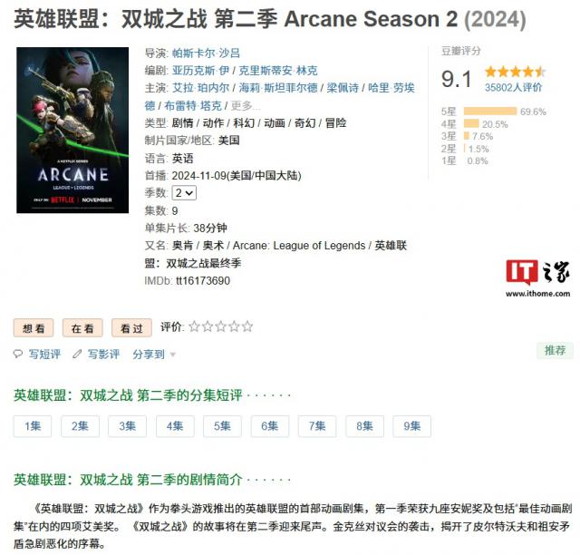 第二季完成了动画剧《英雄联盟:双城对决》,豆瓣评分 9.1