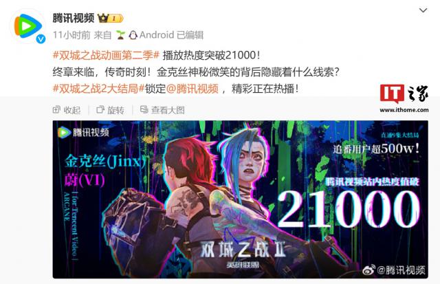 IT 世家 11 月 24 每日新闻,动画剧《英雄联盟:双城对决》第二季在 11 月 9 日开播,共 9 集合,昨天正式完成。腾讯视频昨天发布消息,宣布《英雄联盟:双城对决》第二季热播。突破 21000,追番人数超 500 万。