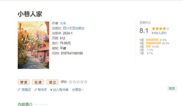尽管之前这部电影的豆瓣评分明显下降,但是在后续的剧情表现下,《巷子人家》终究还是赢了。 8.2 分数好。有意思的是,原著小说《巷子人家》在豆瓣上的评分分为 8.1 分数,而且电视剧的分数还是比原著稍高一些,可以看出,电视剧《小巷人家》是一个非常成功的改编。