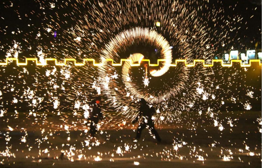 民间艺人在敦煌市党河风情线上表演民间铁花 张晓亮摄