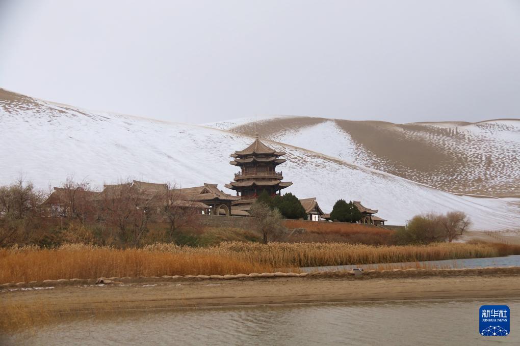 11月23日,受冷空气影响,甘肃省敦煌市自冬季以来首次下雪。鸣沙山月牙泉景区雪景如画,美不胜收。(张晓亮)