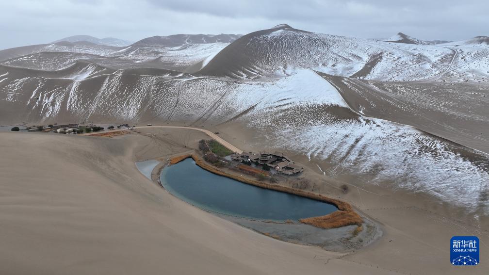 敦煌市鸣沙山月牙泉景区雪景(无人机照片)于11月23日拍摄。新华社(张晓亮)