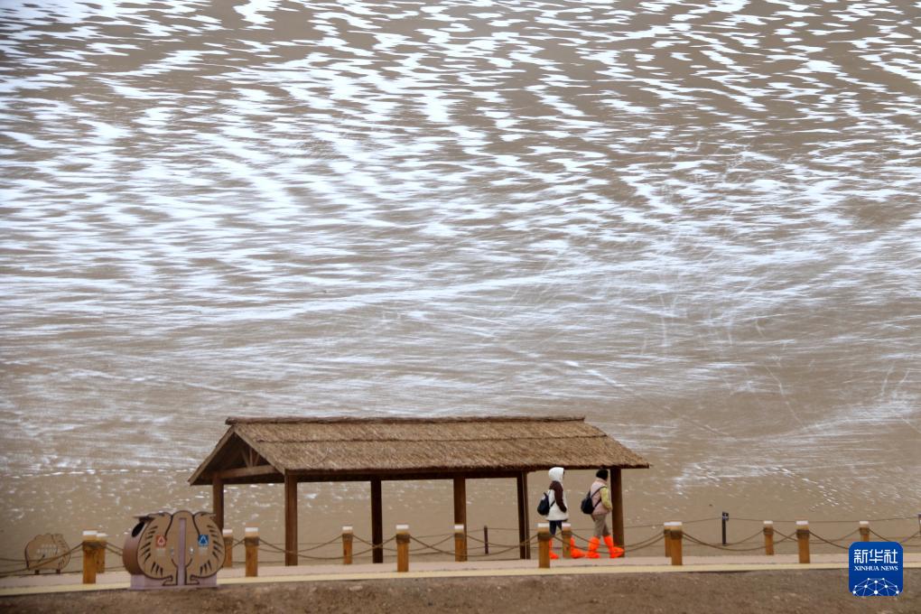 十一月二十三日,游客在敦煌市鸣沙山月牙泉景区欣赏雪景。新华社(张晓亮摄)