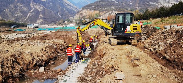 作为区水务局的建设单位,京西门城基础设施投资建设有限公司正在利用秋冬建设的黄金期,加快建设。在施工现场,10 余台工程车和挖掘机紧密配合,清理引流护岸,运输砾石。在浅滩上,小型机器与人工合作铺设生态砖,现场作业井然有序。