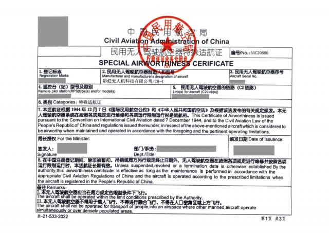 彩虹-4 国内大型民用无人机首次获得特殊适航许可证。