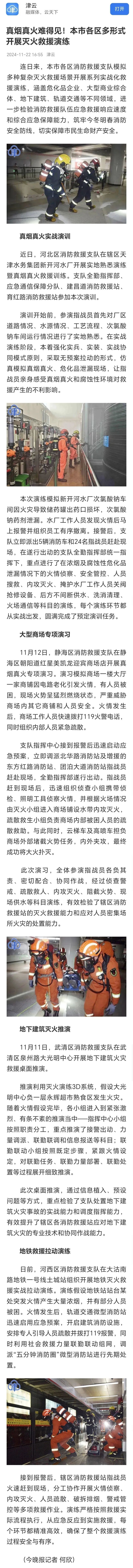 据媒体报道,天津市有多种形式的灭火救援演练。