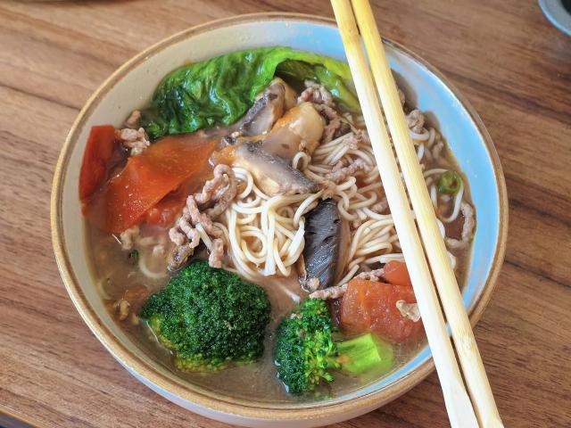 加一点辣椒,加一些中国超市买的李锦记酱油和鸡蛋挂面,简直完美。 ~