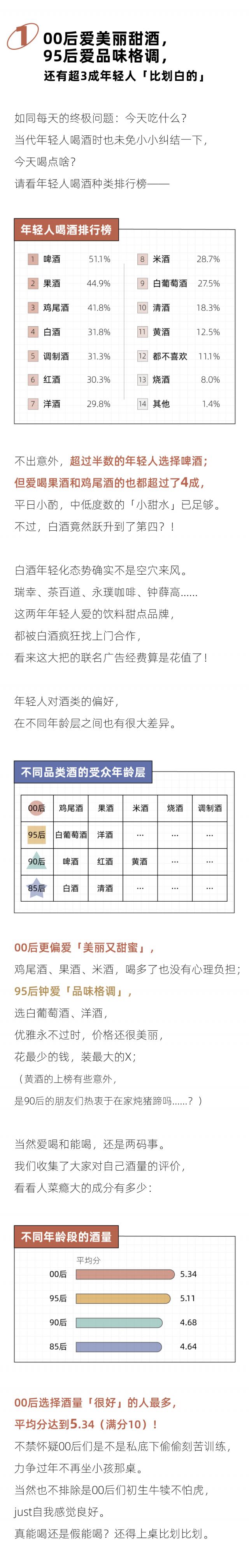 「酒局」曾经让人不得不坐在危险中的隆重和礼仪也在悄然消除。喝酒的地方和场景可以随意移动。你可以在街上的小酒馆里和你的亲戚朋友一起吐露你的心声,或者在你温暖的窝里放一杯鸡尾酒,享受你一个人的时光。看完这份报告,你会发现,从年轻人的消费观念来看,面子不再是第一位的,内心-也就是本质的享受和体验,才是他们真正关心的。