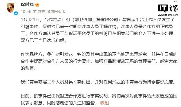 IT 世家 11 月 24 日消息,保时捷 11 月 23 日夜发表声明,回应合作伙伴与货运平台工作人员的纠纷,IT 家庭附件的全文如下: