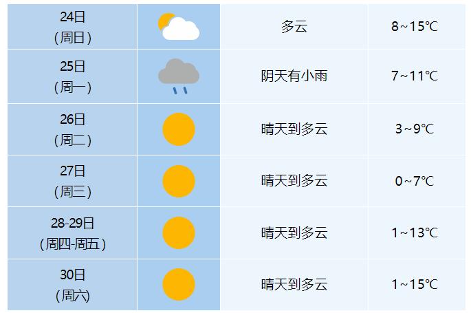 淮北地区和省内山区24日上午最低温度3~6℃,其他地区6℃~9℃。25-27日有一次强冷空气影响我省,全省平均气温将下降7~9℃,同时偏北风力增至4级,阵风6级,~7级,山区及水面阵风8级~9级;26-27日上午,淮北地区北部和省内山区,28日上午,全省很多地区最低气温在0℃左右;之后,我省的气温逐渐上升。