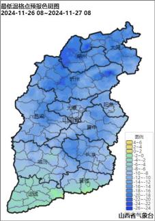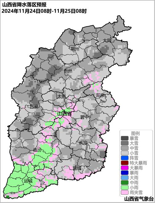 十一月二十四日:全省多云转阴天,有小雪或雨夹雪,大同、朔州、忻州、吕梁、太原、晋中、长治、晋城等地部分地区有中雪,部分地区有大雪;临汾、运城等地部分地区有小雨。夜间全省有4个~5级、短时6~7级西北风,气温明显下降。