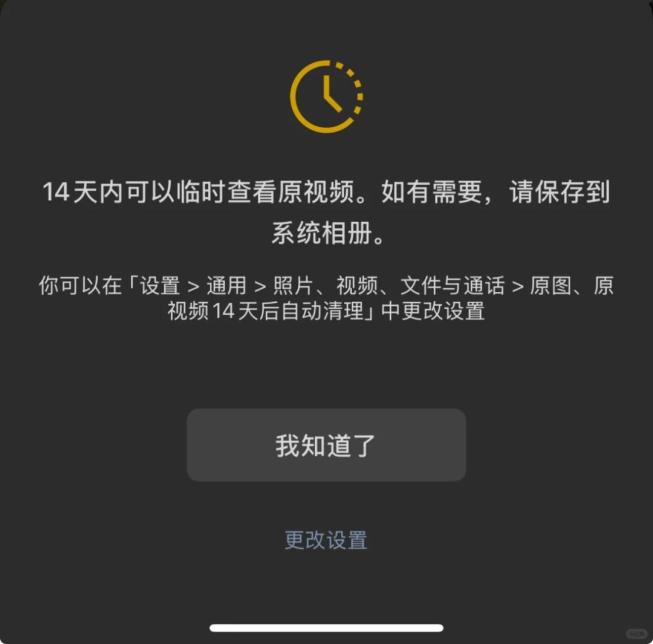 打开这个功能后,如果需要时不时查看高清图片和视频,最好及时保存到系统相册中,防止14天后自动清理干净。