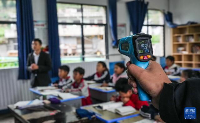 △温度测量设备检查供暖的亮岩小学教室温度在哪里? 19.3 ℃。新华社记者 陶亮 摄