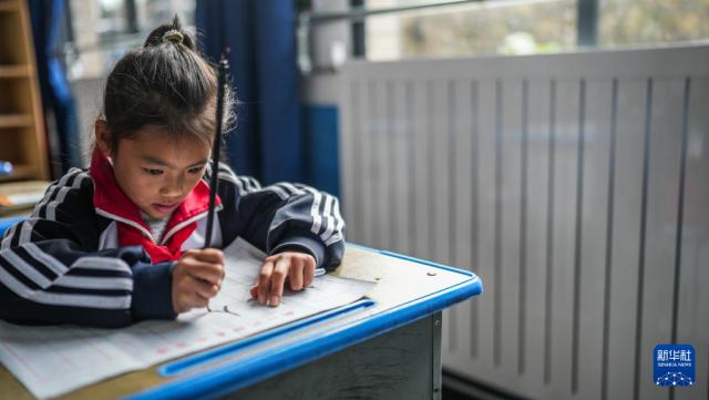 △亮岩小学的孩子们在供暖教室里训练写毛笔字。新华社记者 陶亮 摄