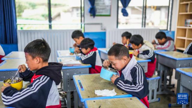 △亮岩小学的孩子们在热气腾腾的教室里吃午饭。新华社记者 陶亮 摄